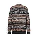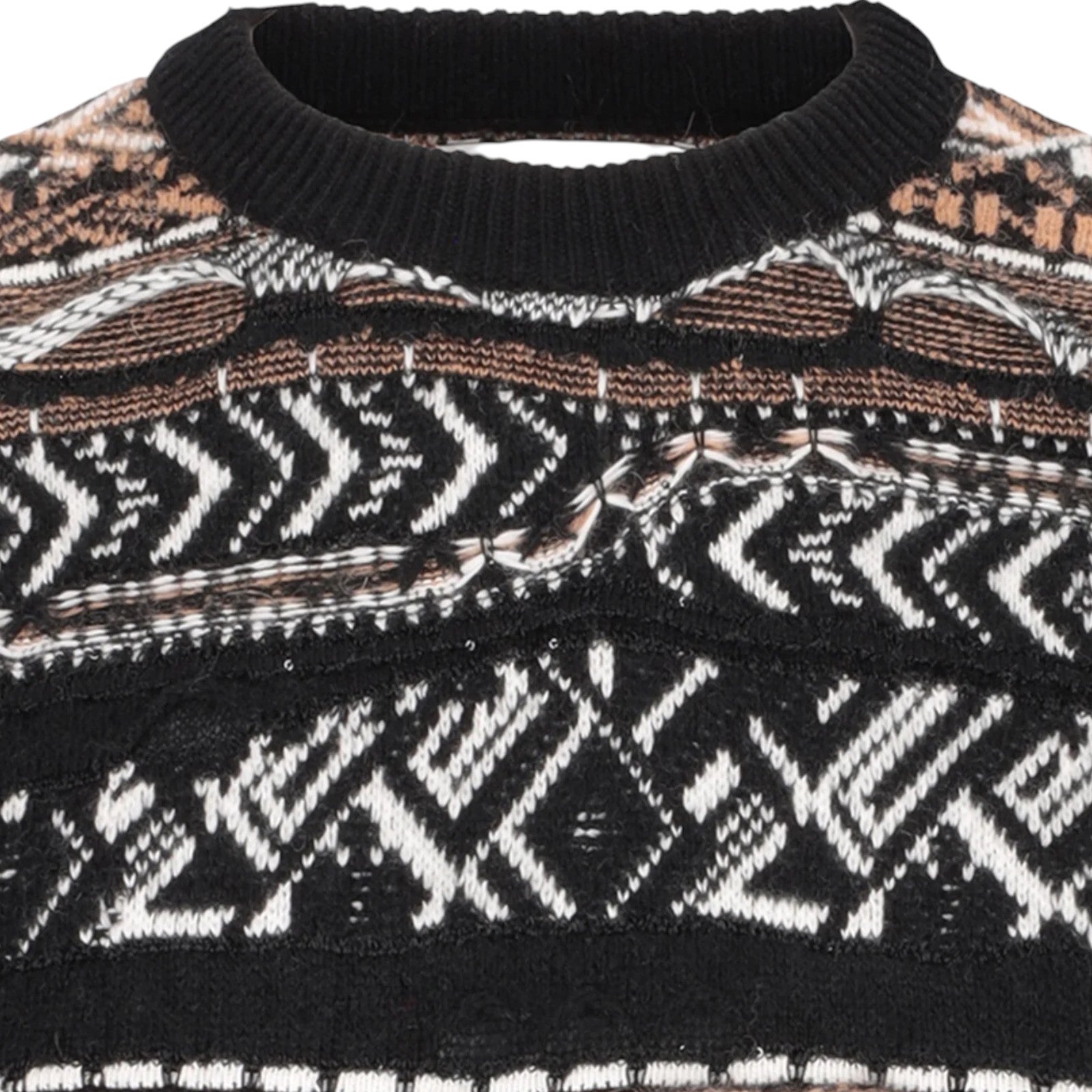 Maglia girocollo firmata Laneus, realizzata con l'iconico jacquard, rivisitato per la nuova stagione. Il motivo multicolore, ricco e dettagliato, include il logo "Laneus" integrato in modo elegante all'interno della trama. La vestibilità è regular, con finiture a costine su collo, fondo e polsi.
