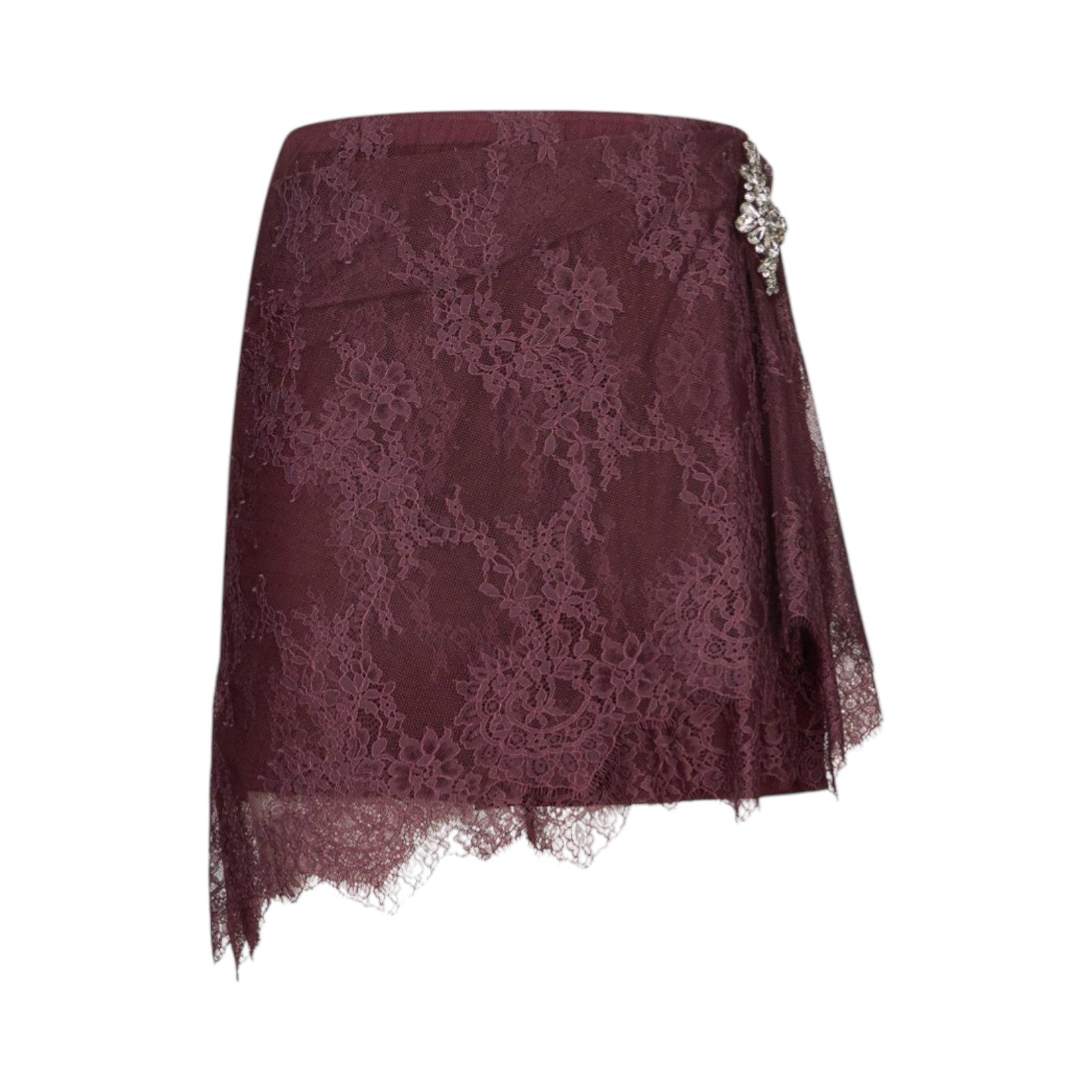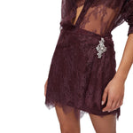 Gonna corta bordeaux in pizzo chantilly. Drappeggio con ricamo gioiello. Fodera interna. Chiusura con zip sul lato.
