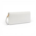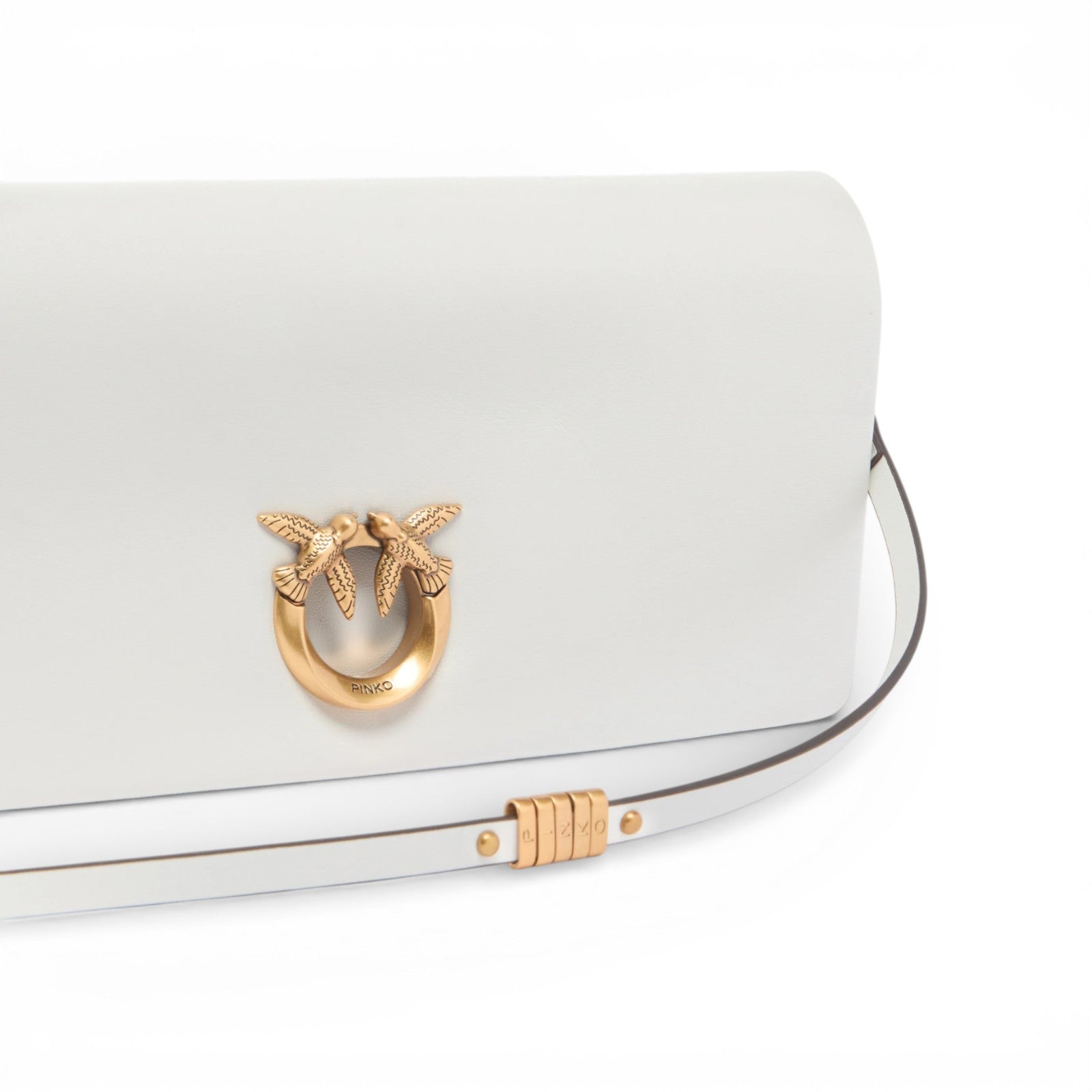 Pochette Love Bag Click Soft Horizontal di medie dimensioni dal design piatto e dalla forma rettangolare, realizzata in morbida pelle. La borsetta, imbottita e personalizzata dall'iconico logo metallico Love Birds Diamond Cut sul davanti, può essere indossata a spalla, crossbody oppure a mano grazie alla tracolla in pelle rimovibile, decorata da anellini in metallo che formano il logo lettering PINKO. La chiusura con due bottoni interni a calamita rivela un interno foderato in drill di cotone con tasca a parete chiusa da zip.