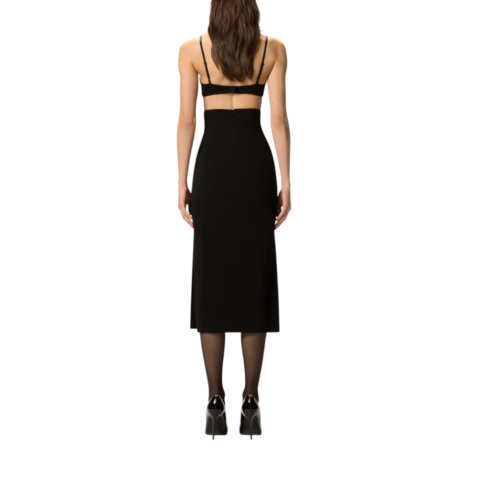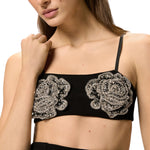 Top a fascia stile reggiseno, realizzato in un tessuto di viscosa stretch dalla mano compatta e dotato di comode spalline sottili regolabili e di una chiusura con gancetti sul retro. Il modello è reso speciale dalle applicazioni sul davanti: due delicate rose in tulle, sapientemente ricamate a mano con effetto tridimensionale e decorate da cristalli di diverse forme e dimensioni che riflettono la luce con eleganza.