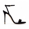 Sandalo con cinturino alla caviglia con fibbia in metallo e tacco scultura con logo in metallo colore oro sulla base. La tomaia è composta da un listino sulla parte davanti ed un cinturino cross sul retro.
