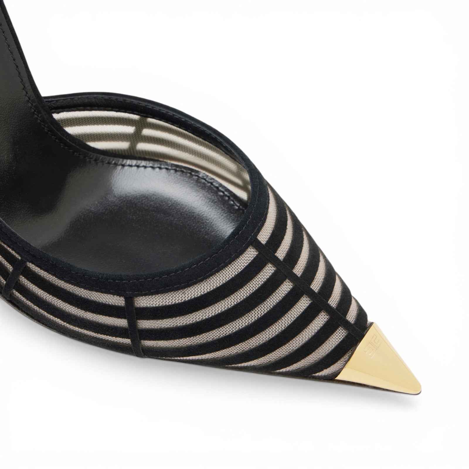 Slingback realizzate in suede con cinturino alla caviglia. Si distinguono per il motivo a righe esaltato dagli inserti in tulle e per la punta con finitura dorata e logo. Il tacco stiletto regala una silhouette slanciata.