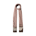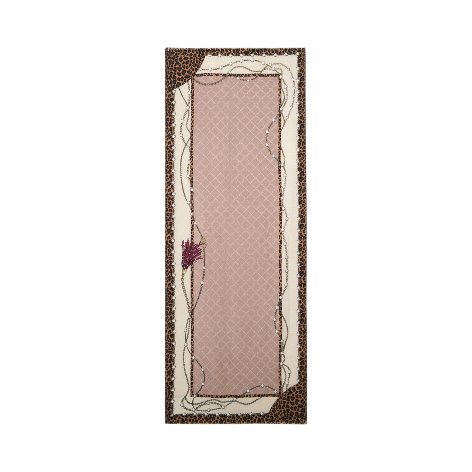 Stola marrone. Stampa animalier con logo. Bordi sfrangiati. Misure: 70 x 180 cm. Presenta pochette logata.