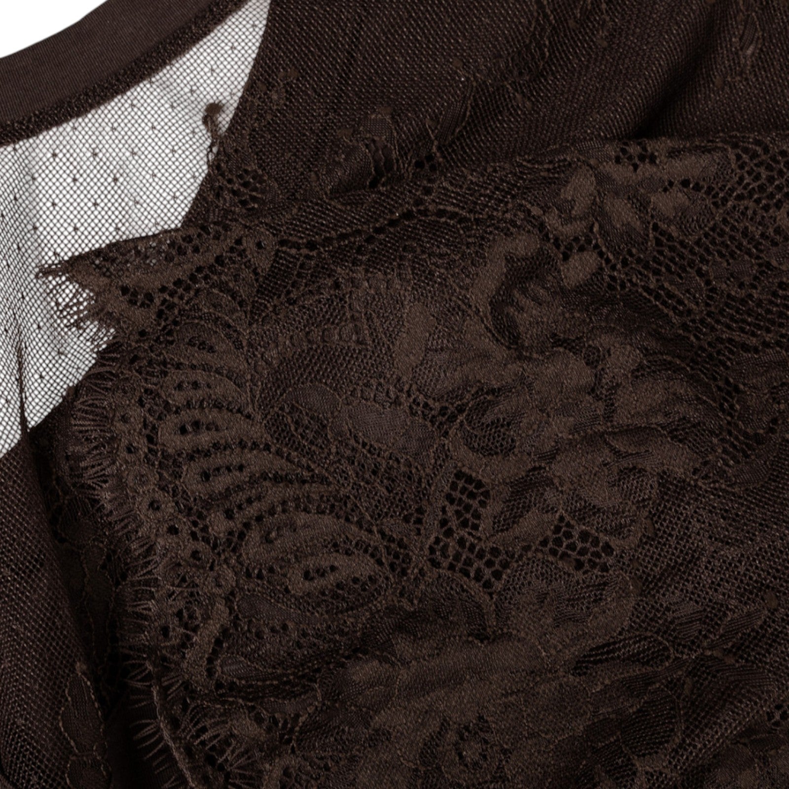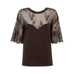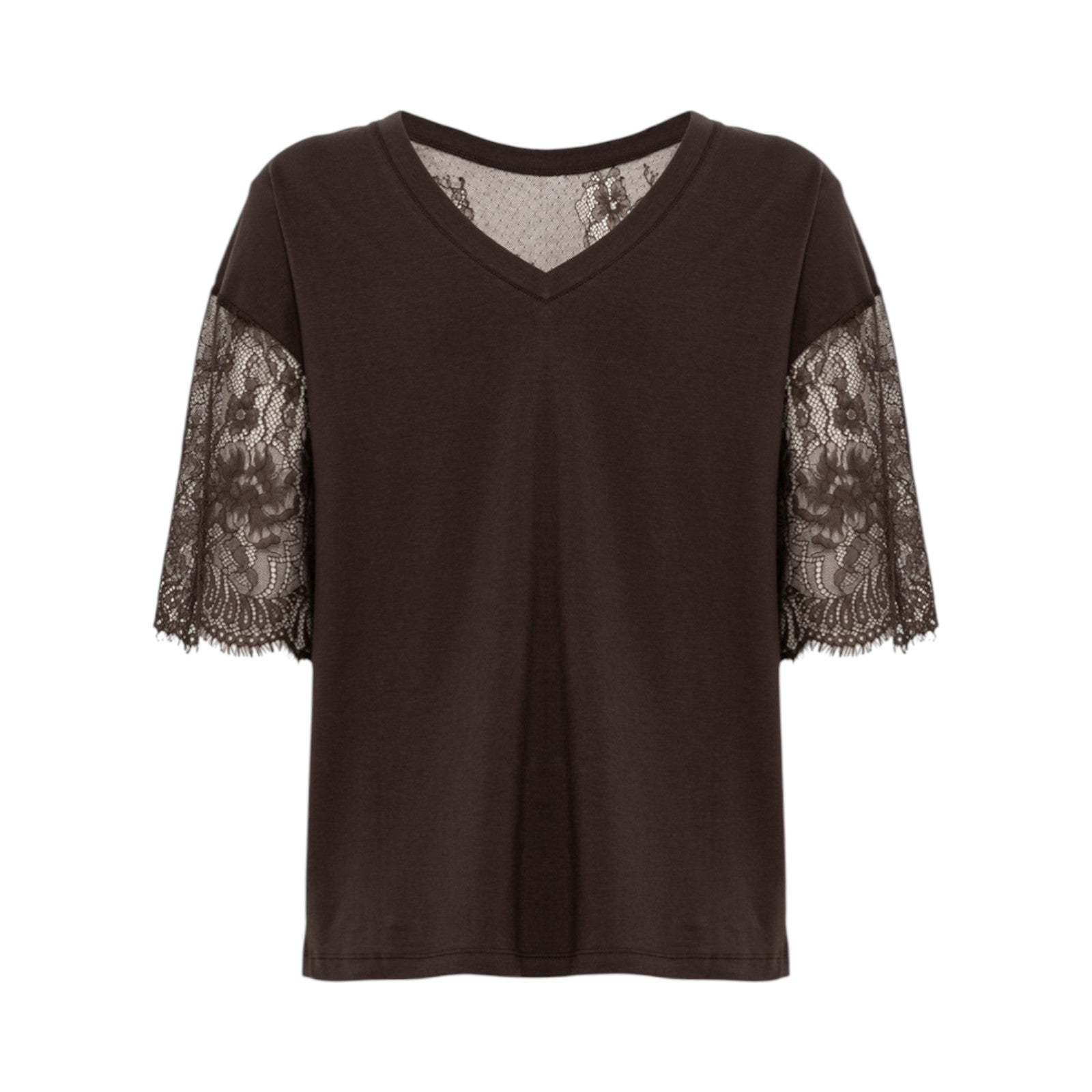T-shirt in jersey di cotone con maniche corte decorate da inserti in pizzo smerlato, ha scollatura a v e linea dritta.
