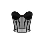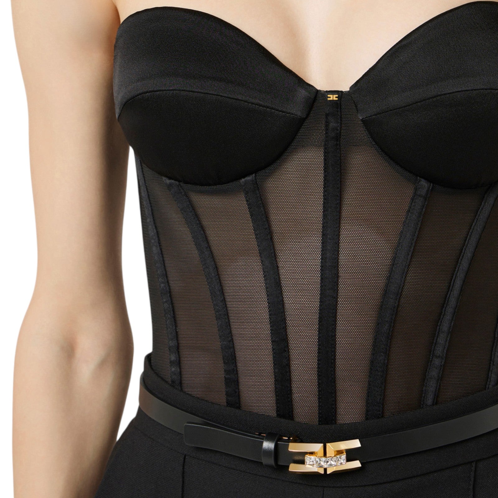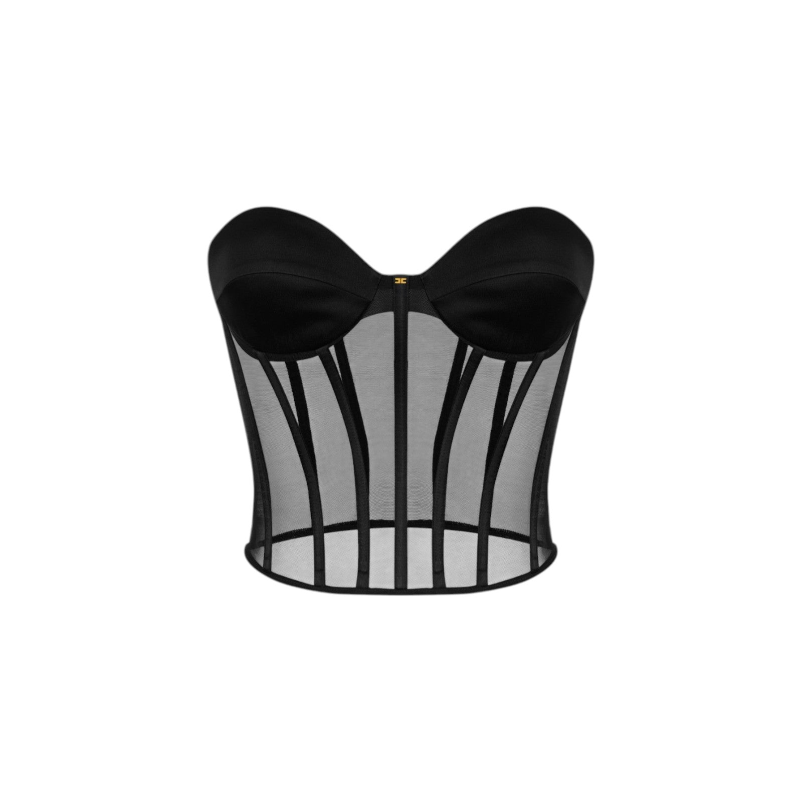 Top in tulle. Si distingue per la sensuale costruzione a bustier, con stecche interne e coppe rivestite in raso. Un piccolo dettaglio con logo in metallo dorato brilla sul busto e aggiunge un tocco prezioso. Vestibilità aderente.