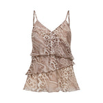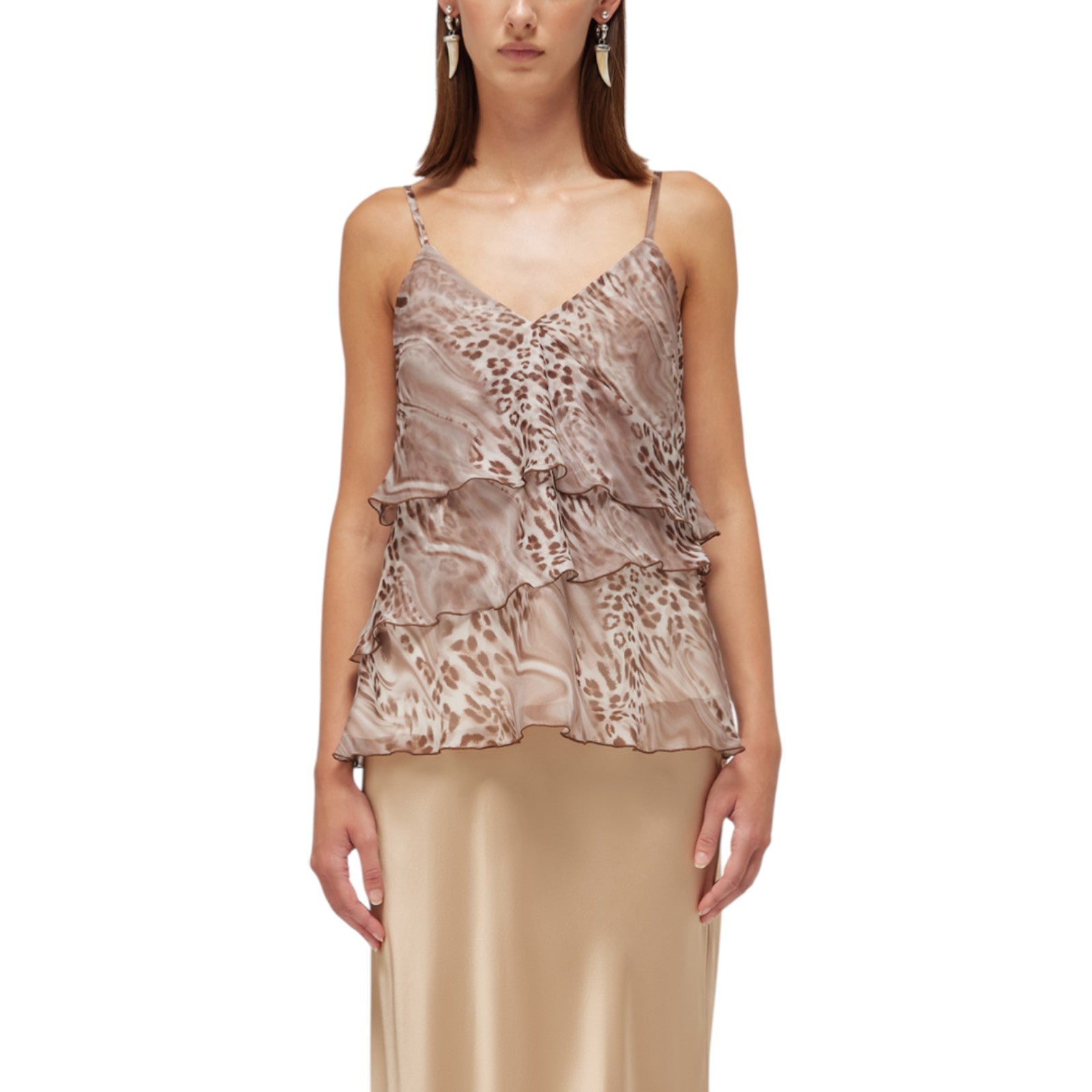 Top in chiffon animalier con giochi di grafiche e balze, hanno spalline sottili, scollatura a v, balze rifinite con filo, fodera.
