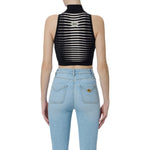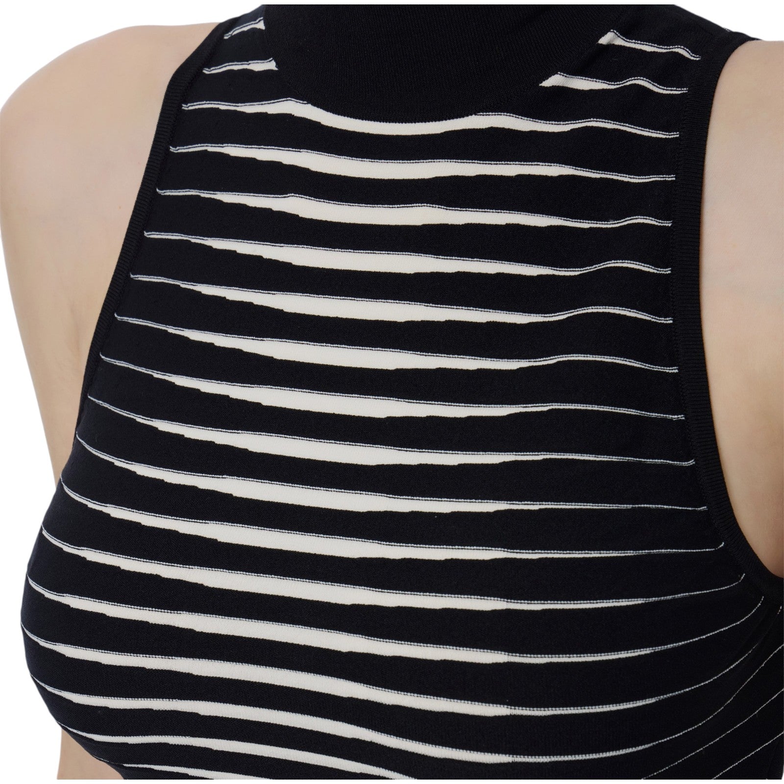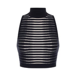 Top in maglia smanicato con collo alto. La lavorazione jacquard ricrea un pattern a righe dégradé, in colori a contrasto per un effetto zebra. L'etichetta con logo sul retro completa il capo. Vestibilità aderente.