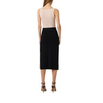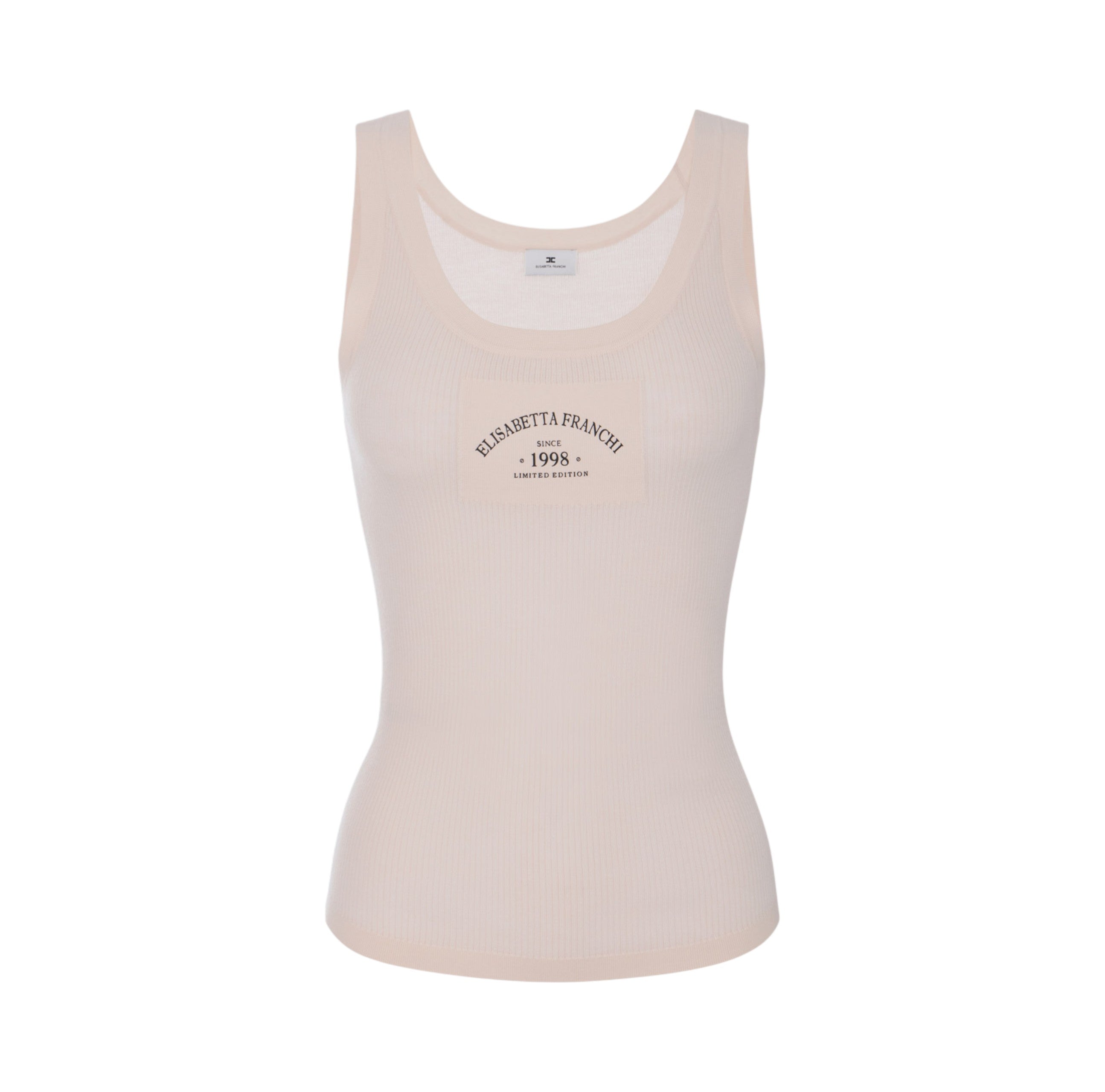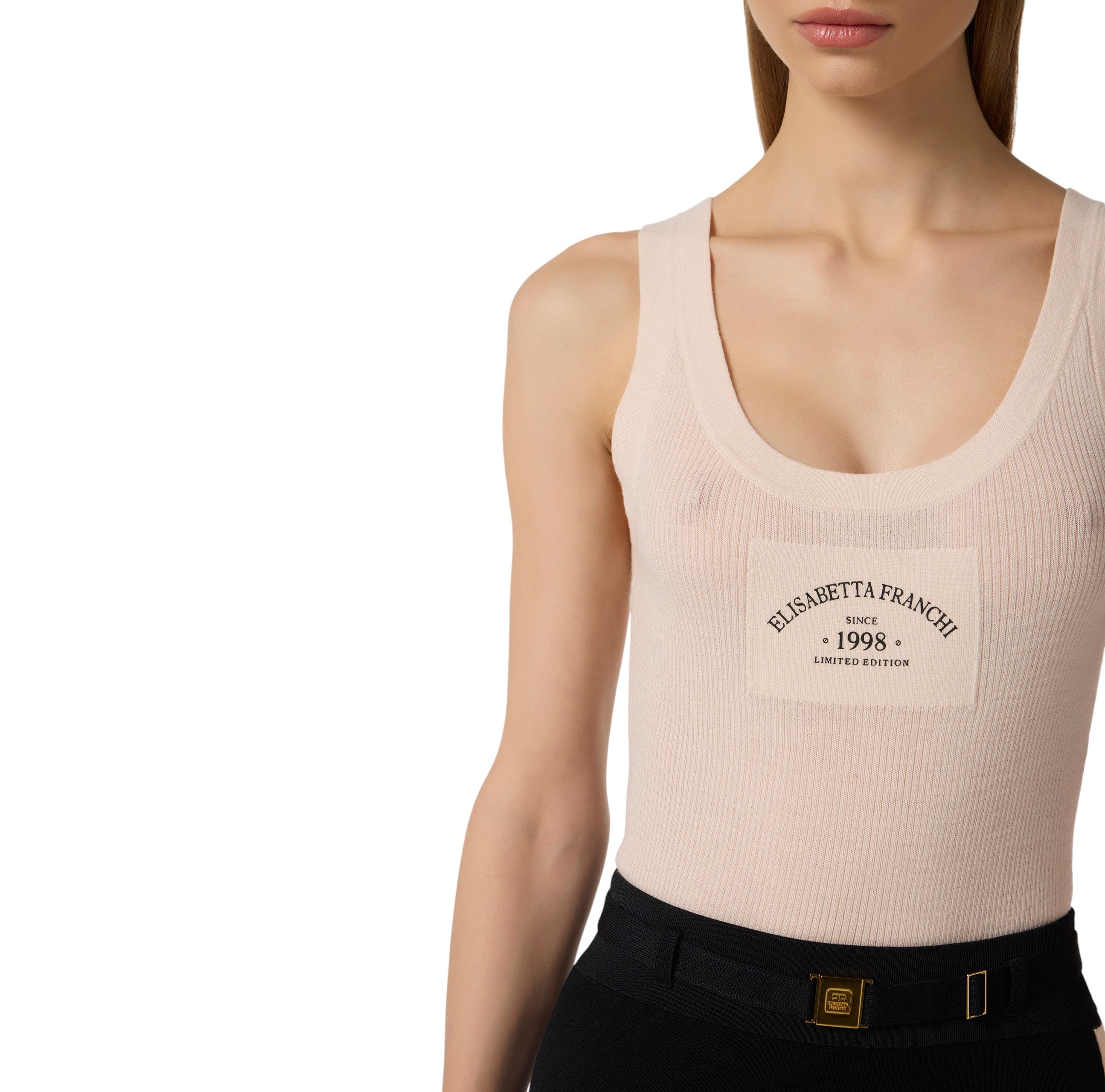 Top in maglia con scollo rotondo. Ha lavorazione a costine e si distingue per l'intarsio in maglia rasata dove compare la stampa con logo. Vestibilità aderente.