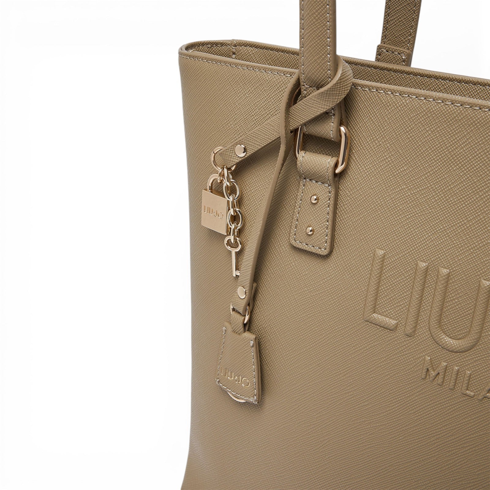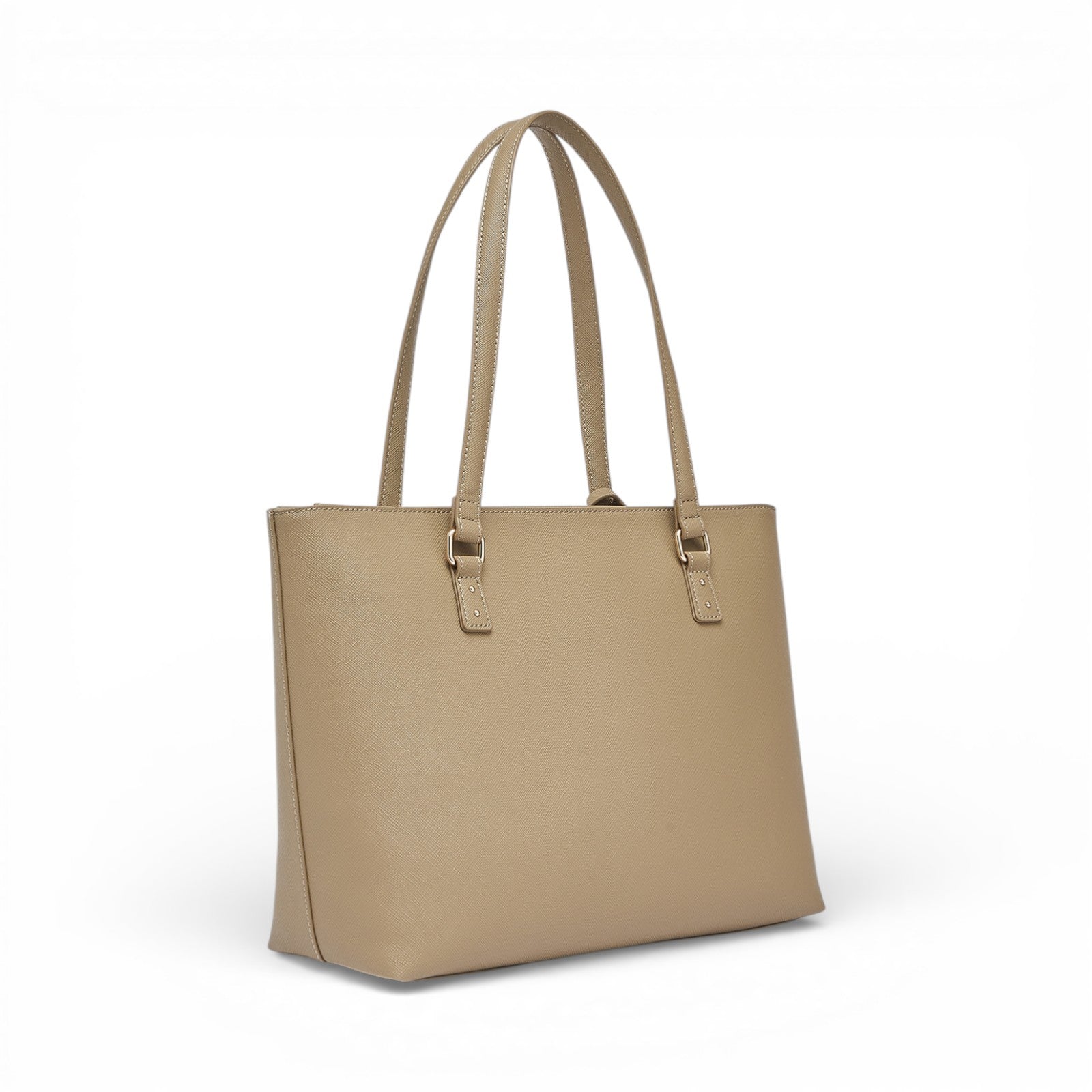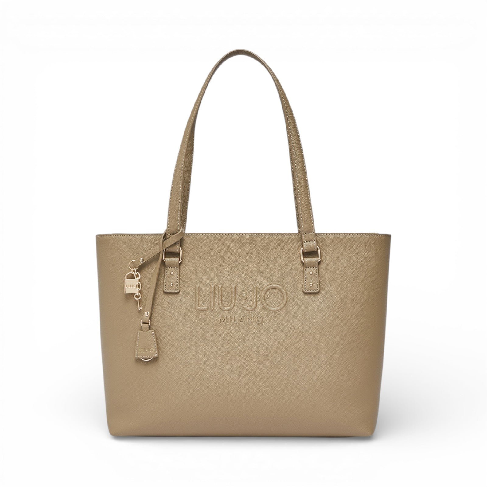 Tote bag grande. Stampa saffiano. Logo in rilievo. Fodera logata. Chiusura con zip. Charm removibile.