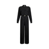 Tuta da donna. Camicia in crêpe. Colletto alla coreana. Finte tasche. Chiusura con bottoni nascosti. Pantaloni palazzo con pince. Cintura con logo monogram. La modella è alta 180 cm e indossa la taglia 40.