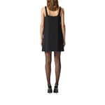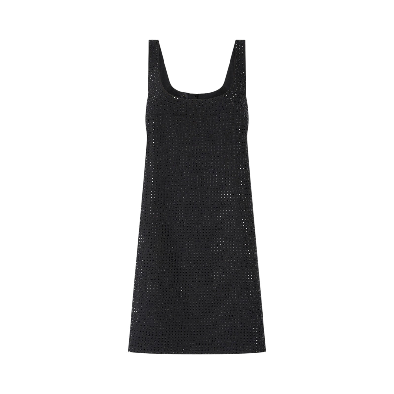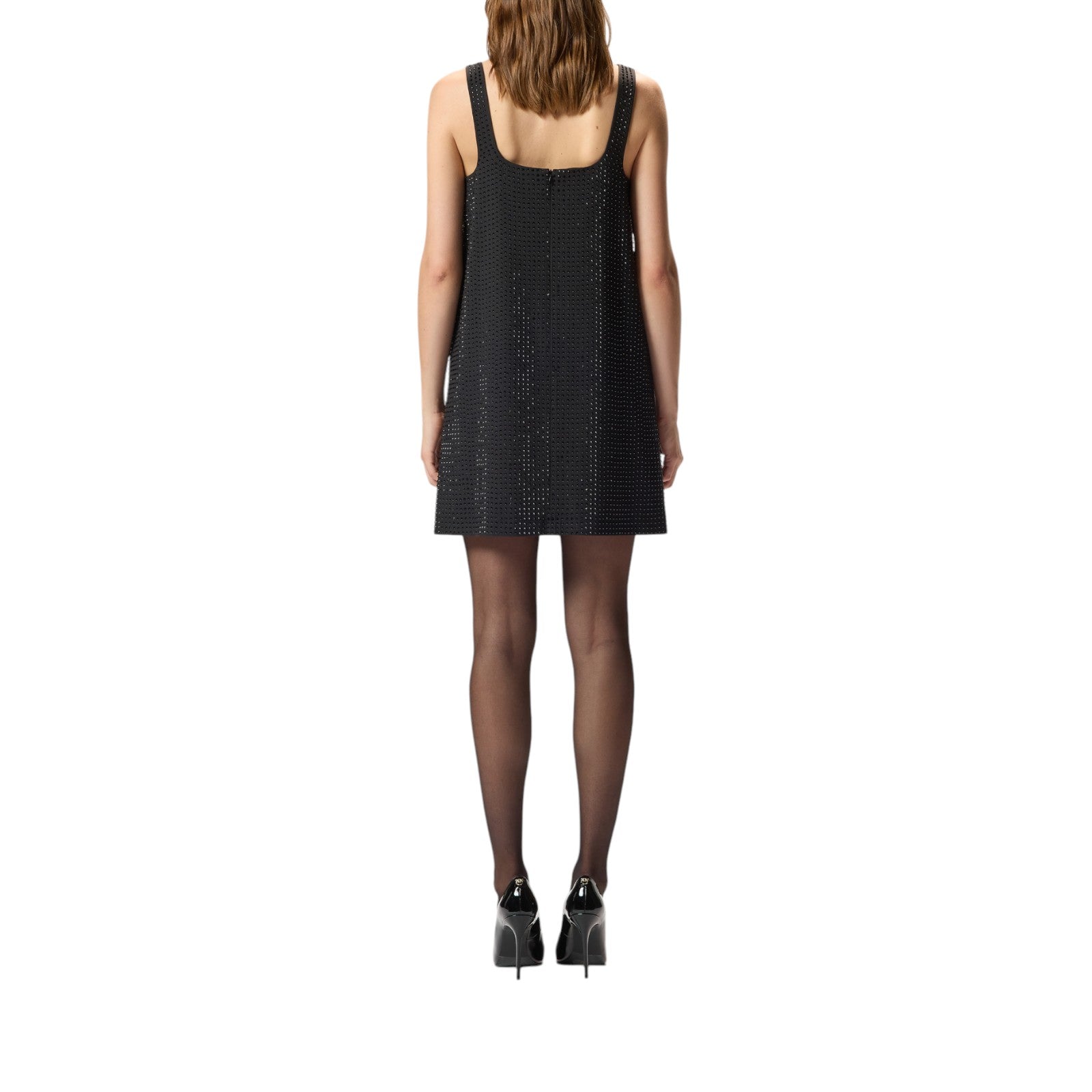 Vestito corto dalla linea leggermente svasata con spalline, scollo quadrato e zip sul retro. Gli innumerevoli strass in tono, i veri protagonisti del look, rivestono l'intera silhouette e donano all'abito un tocco scintillante.