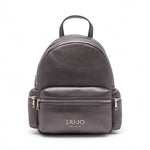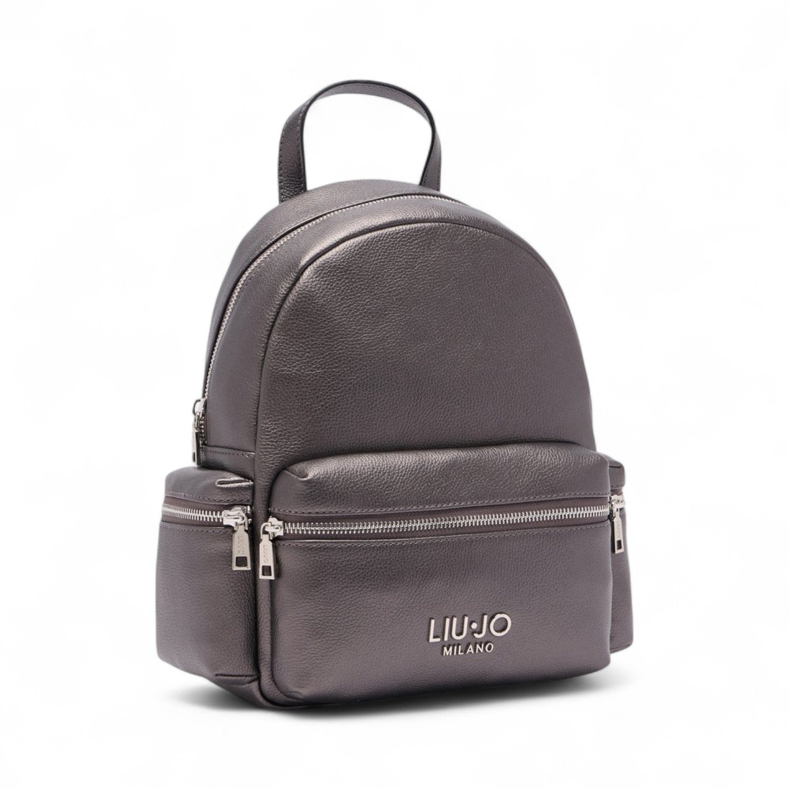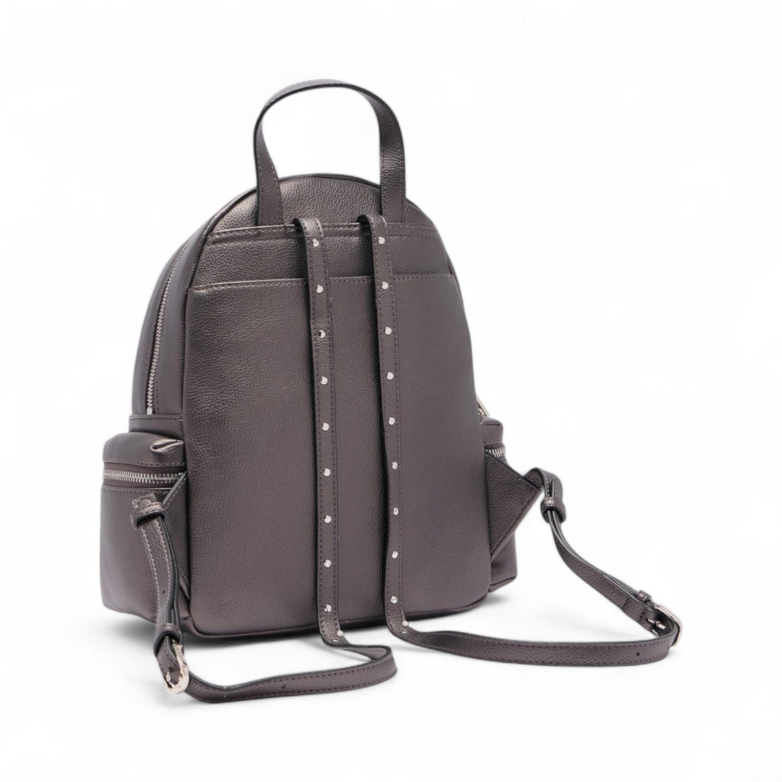 Zaino grigio. Stampa effetto bottalato. Logo in metallo. Tasca frontale con zip. Tasche laterali con zip. Spallacci regolabili con borchie. Tasca interna con zip. Etichetta interna logata. Fodera interna logata. Chiusura con zip. Misure: 29 x 9 x 30 cm.